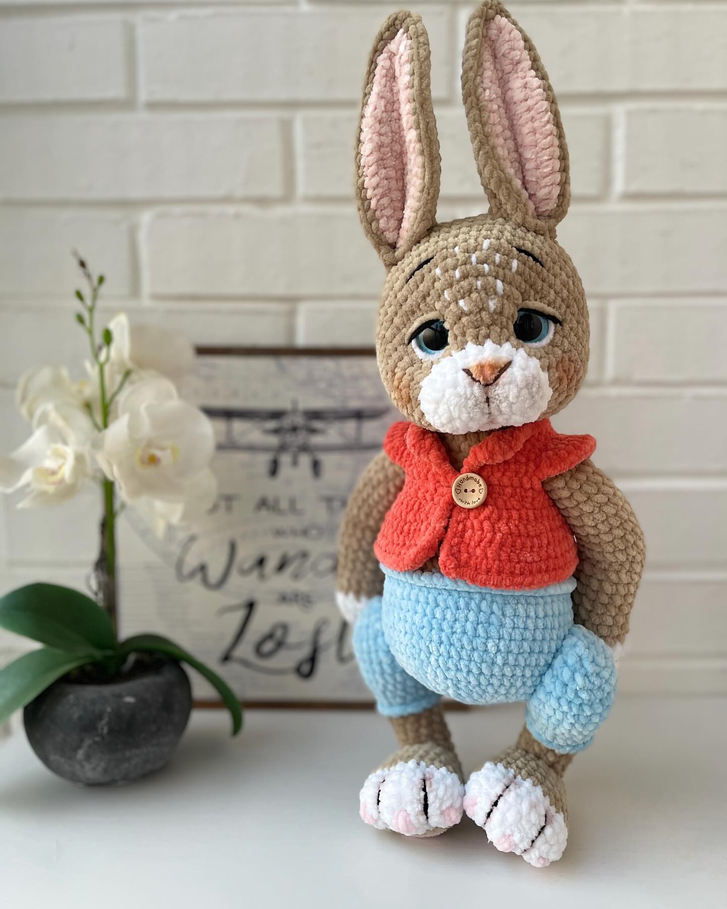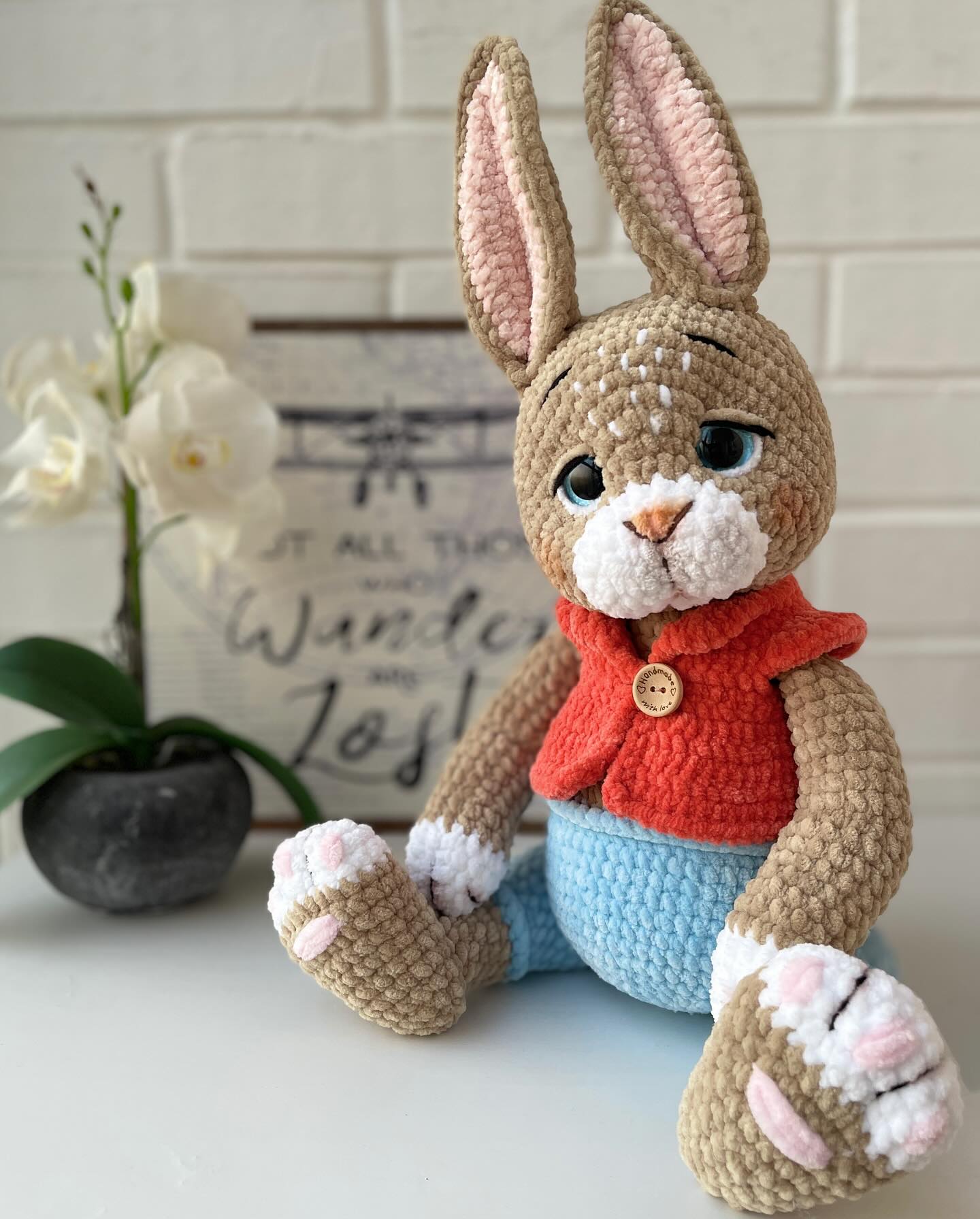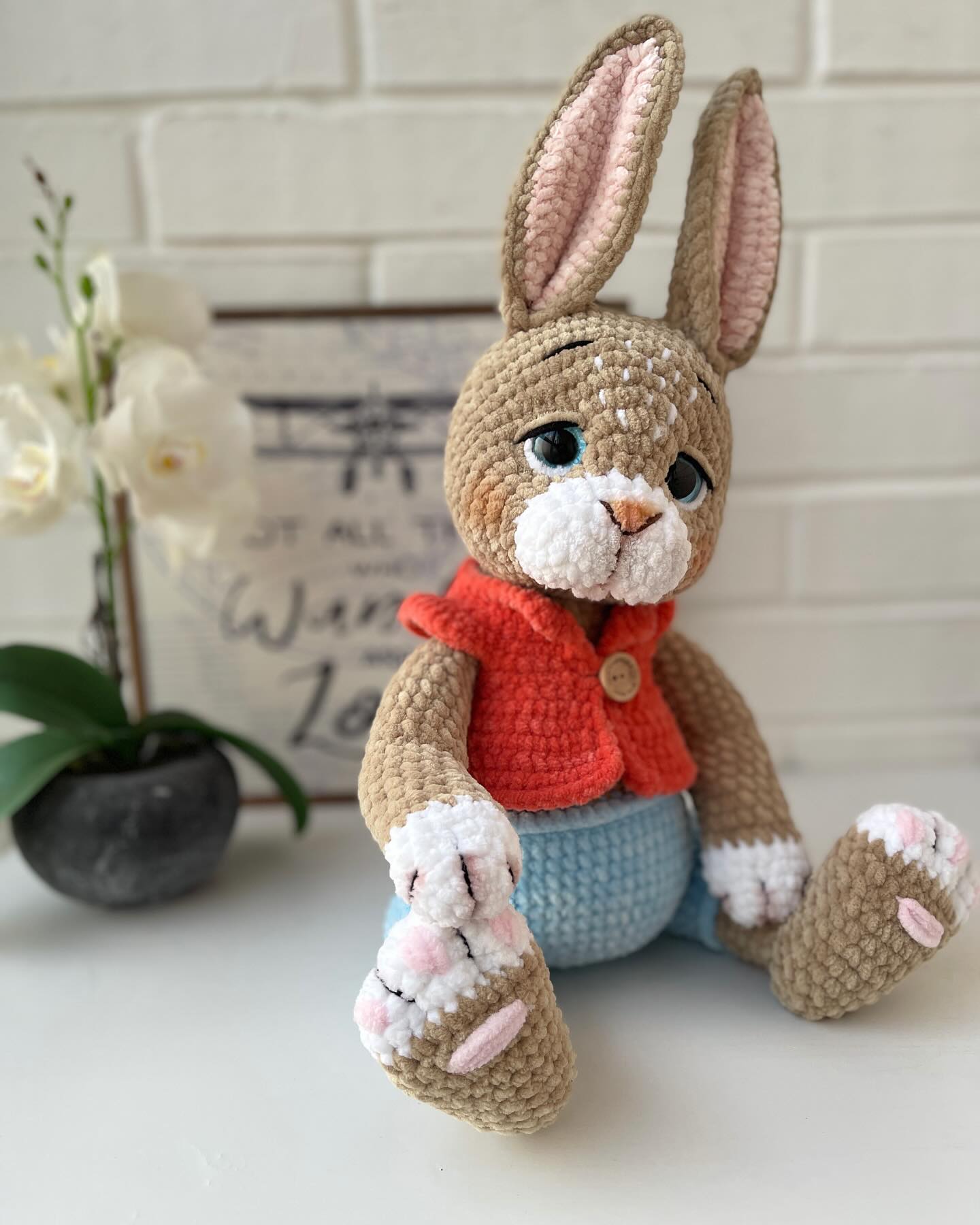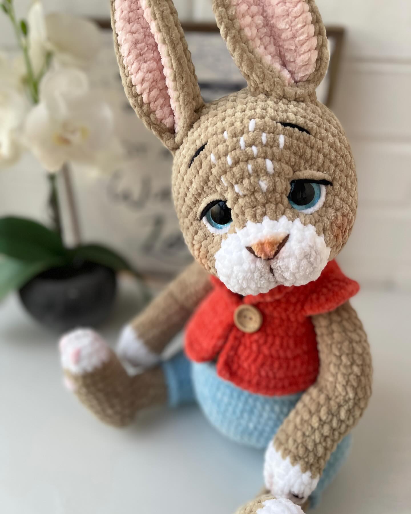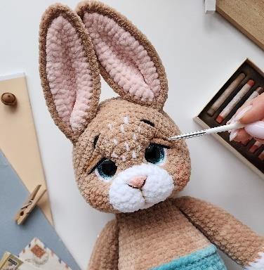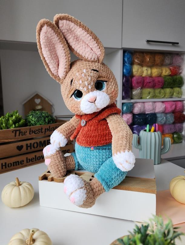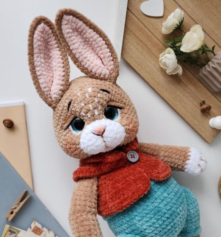This pattern is perfect for those who love crafting whimsical companions full of personality. From his carefully sculpted muzzle and expressive eyebrows, to his sweet vest fastened with a tiny button, every stitch adds charm and uniqueness. The finished bunny is designed to be cuddly yet elegant, making it a delightful gift, a nursery decoration, or a collectible piece for amigurumi lovers.